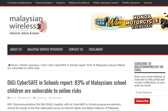 Malaysian Wireless. (2018) DiGi CyberSAFE in Schools report: 83% of Malaysians school children are vulnerable to online risks. | Malaysian Wireless. [online] Available at: https://www.malaysianwireless.com/2014/09/digi-cybersafe-schools-report-83-malaysians-school-children-vulnerable-online-risks/ [14 October 2018].